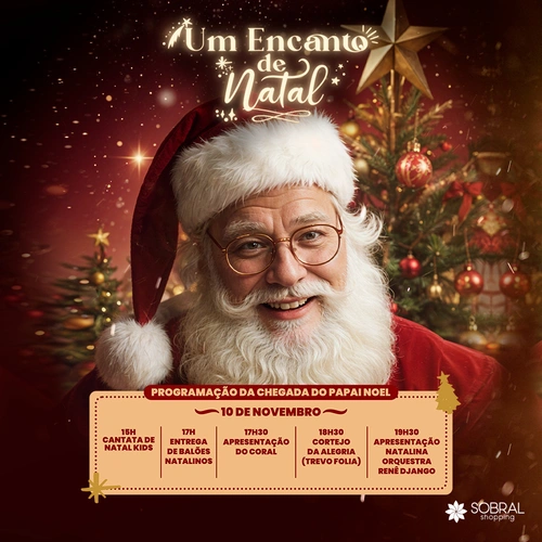 O clima natalino está chegando ao Sobral Shopping e no dia 10 de novembro, o Seu Shopping recebe o bom velhinho em grande estilo, com uma programação especial para toda a família. A chegada do Papai Noel promete encantar crianças e adultos com muita magia e alegria!