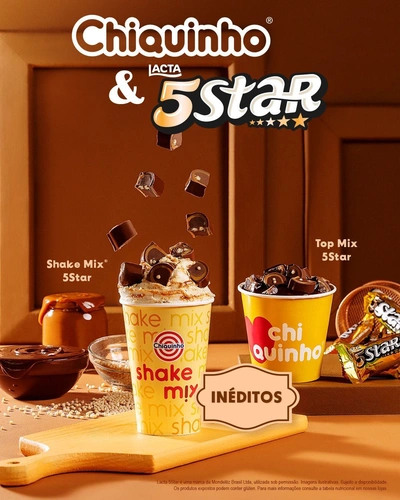 Os novos Shake Mix® e Top Mix Chiquinho® & 5Star chegaram para deixar o seu sorvete irresistível! Nessa combinação inédita, você aproveita uma sobremesa geladinha cheia de chocolate, caramelo e pedaços de biscoito.