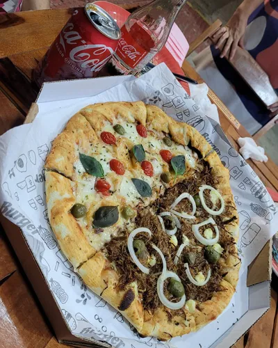 Comemos pizzas deliciosas nos sabores de marguerita, bacon e carne do sol com marguerita, acompanhado dos produtos Coca Cola. E de sobremesa um saboroso pudim.