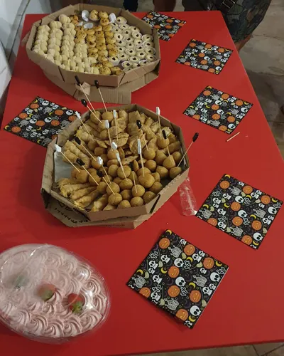 Teve um lindo bolo, deliciosos salgados e bebidas a vontade.