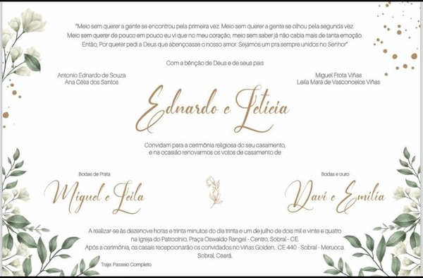 Estarei hoje prestigiando a celebração das “Bodas de Ouro”, do Dr. Davi e Dona Emília, bodas de prata de Miguel e Leila Viñas e o casamento de Ednardo e Letícia Vinas.