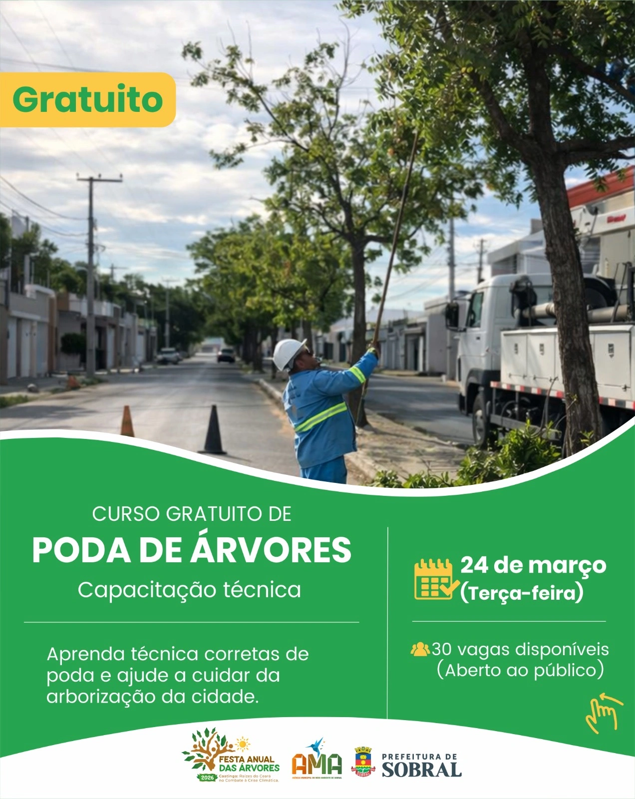 A Prefeitura de Sobral, por meio da Agência Municipal do Meio Ambiente (AMA), realiza, no dia 24 de março, um curso gratuito de capacitação em poda de árvores, voltado à população interessada em aprender técnicas adequadas de manejo e cuidado com a arborização urbana. Serão disponibilizadas 30 vagas, abertas ao público em geral.