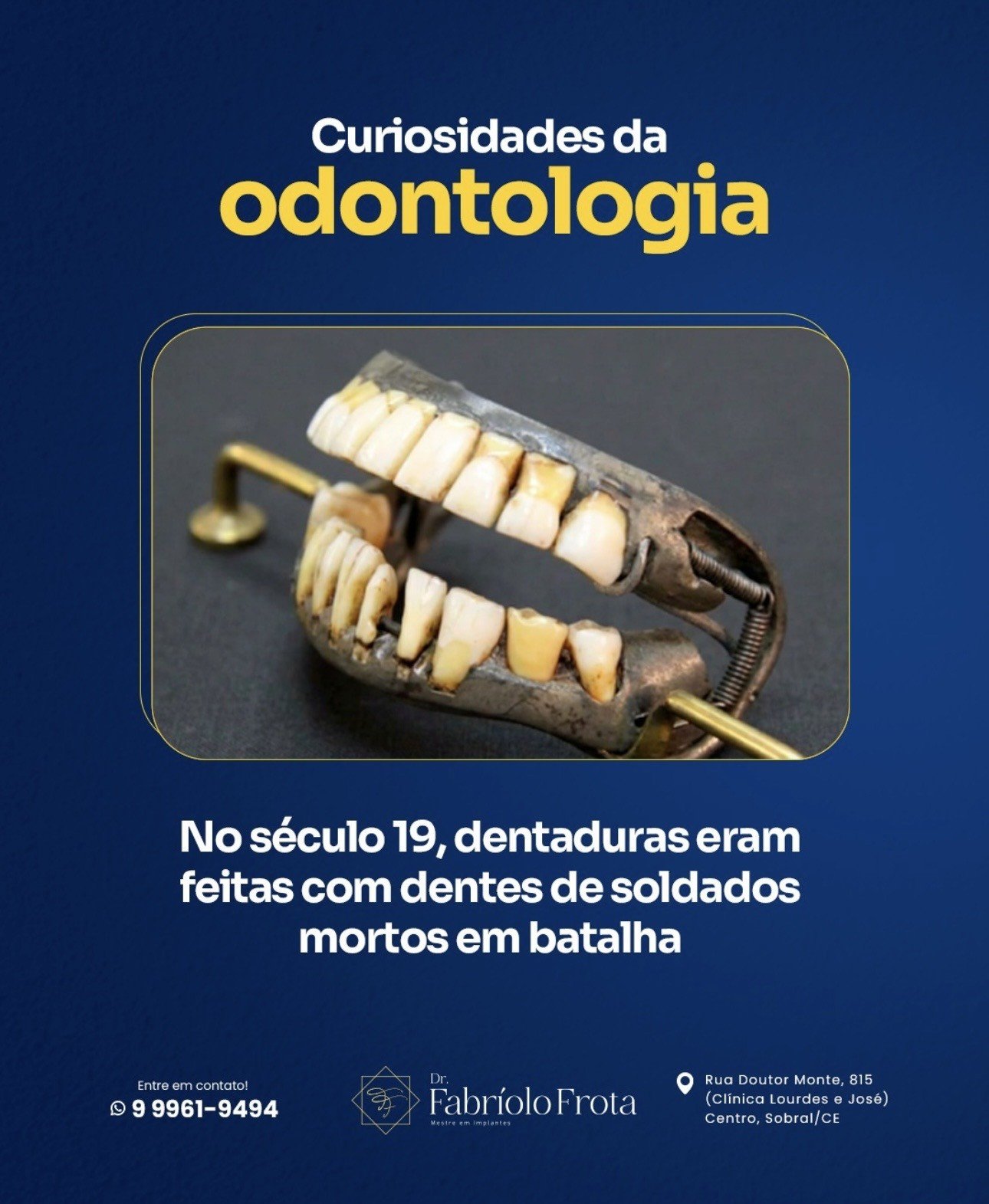 Você já imaginou usar dentes de outra pessoa na sua prótese? 😳 Pois é! No século 19, isso era realidade. Após batalhas, dentes de soldados falecidos eram reaproveitados para confeccionar dentaduras. Eram chamados de “dentes de Waterloo”.