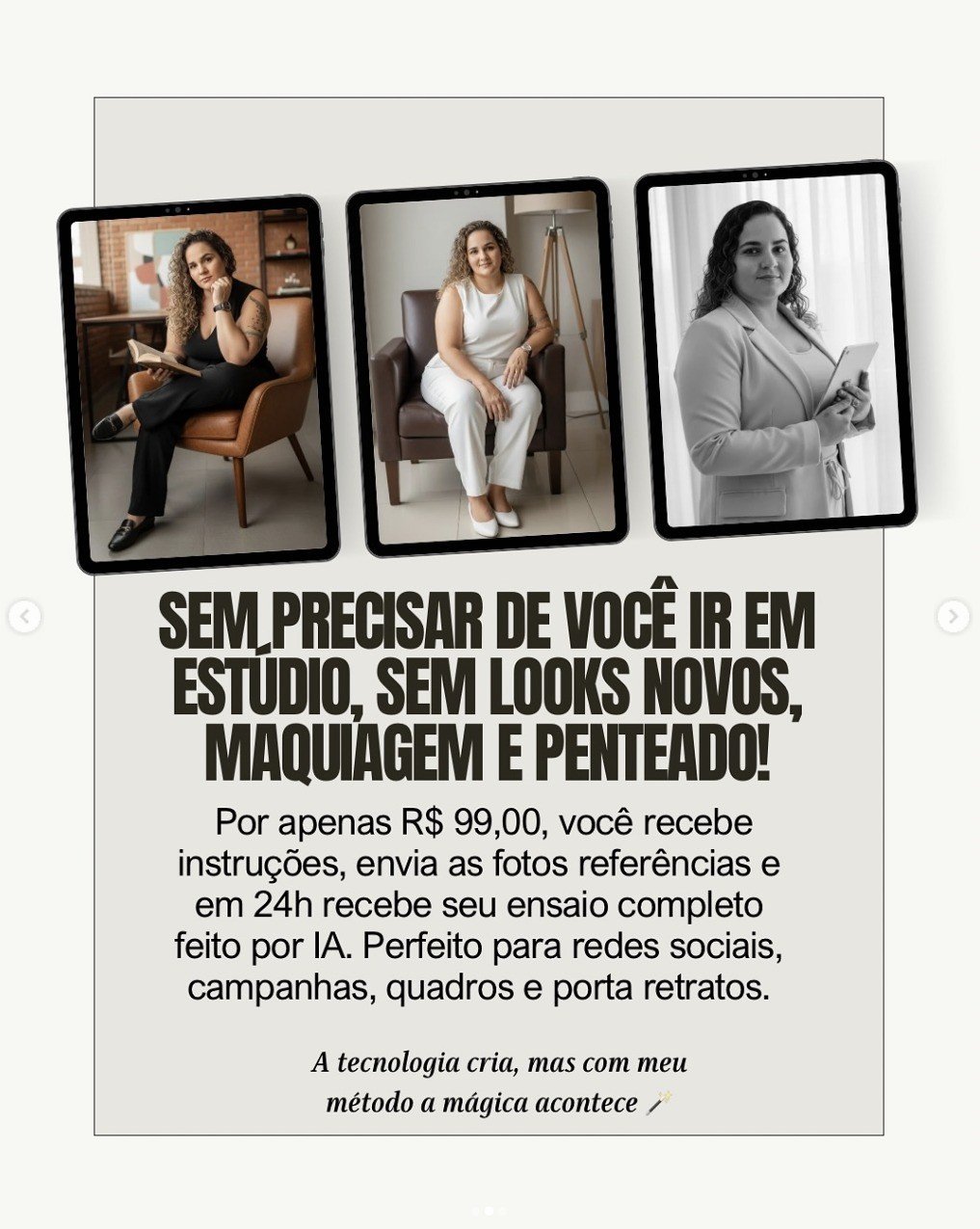 Com o Ensaio Digital desenvolvido por Layane Dola, você recebe imagens com qualidade de estúdio profissional, criadas 100% por Inteligência Artificial, mas com direção artística humana em cada detalhe. É simples, veja: