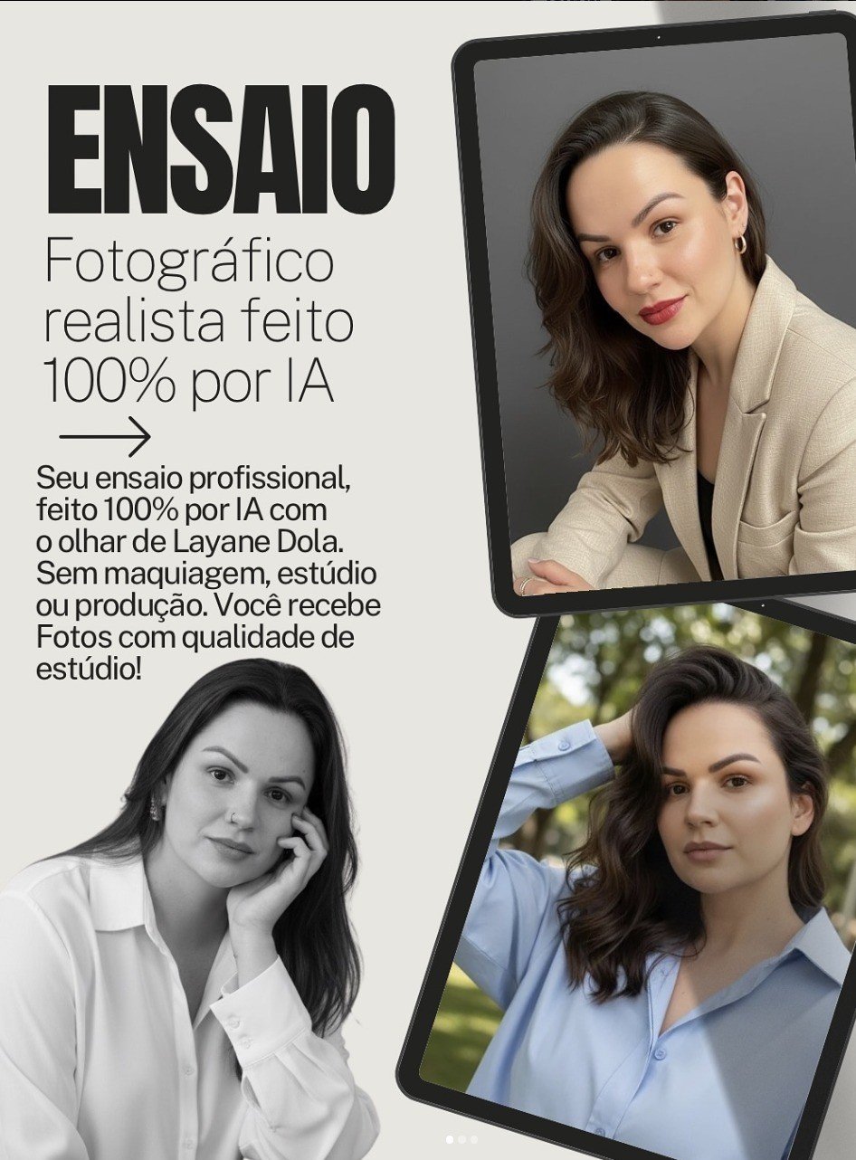 Se você precisa de fotos profissionais para suas redes sociais, eventos ou palestras, precisa conhecer o trabalho de fotos com Inteligência Artificial da Layane Dola (Instagram: @layanedola_ ). Com seu olhar apurado e metodologia exclusiva, Layane se especializou em IA e tem surpreendido com ensaios digitais incrivelmente realistas.