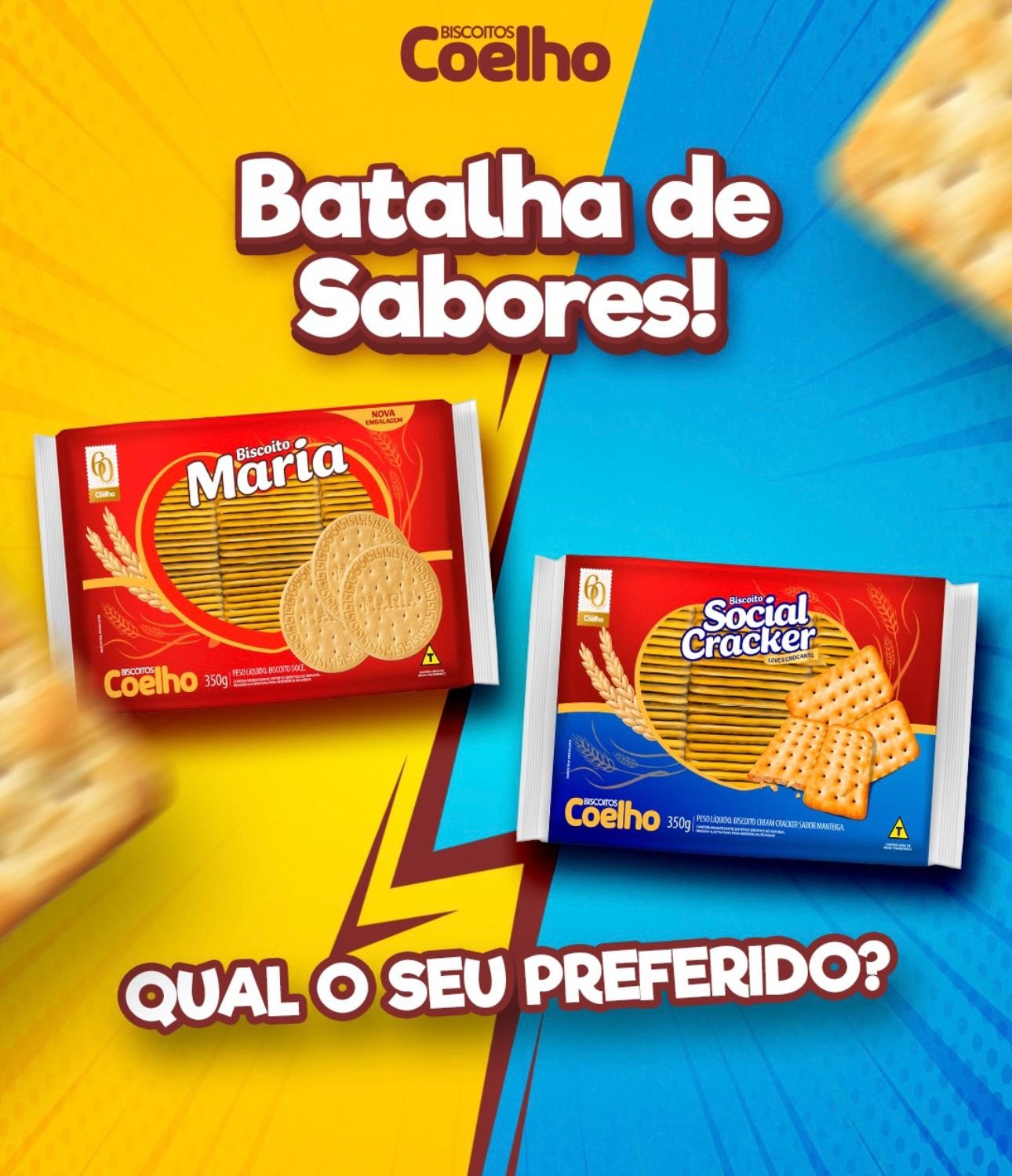 De um lado, a clássica Social Cracker Coelho, sempre crocante e perfeita para qualquer combinação salgada.