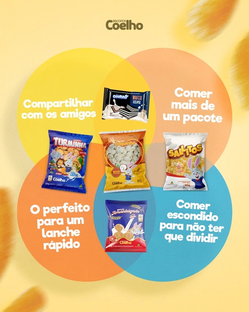 😋 Seja para comer escondido ou dividir com os amigos, a Coelho sempre vai estar presente. E a gente sabe que você vai comer mais de dois pacotes do seu preferido!