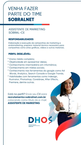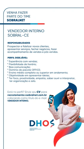 Atenção para as oportunidades de vagas de emprego disponíveis na SobralNet! Faça partedo nosso Time!