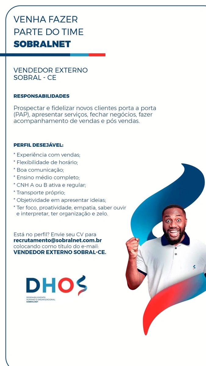 A SobralNet está contratando vendedor externo para Sobral/CE! Acesse já o Instagram @sobralnet e confira os requisitos e como entrar em contato!