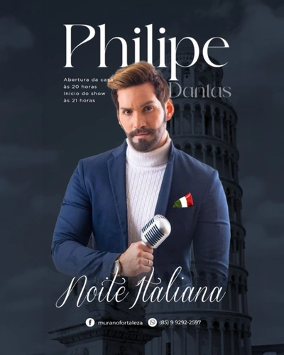 Sábado, dia 18, o grande Philipe Dantas estará em Fortaleza/CE na linda Casa Murano para uma noite italiana. Com sua voz poderosa e emocionante, ele trará clássicos que irão aquecer os corações e transportá-los para os encantadores restaurantes de Roma e Veneza. Bravo!