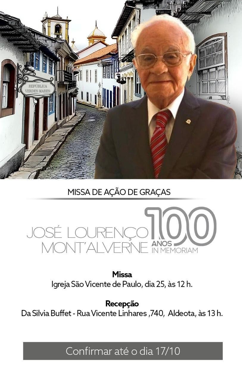 *Acontece hoje dia 25/10, em Fortaleza, a Missa de Ação de Graças em memória de José Lourenço Mont’Alverne, marcando o centenário de nascimento de uma personalidade lembrada com carinho e respeito por familiares e amigos.