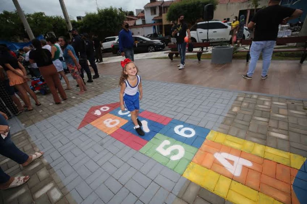 A praça tem ainda piso em pedra cariri e porcelanato, vagas de estacionamento, jardim, além de bancos, lixeiras e iluminação em LED, em uma área total de 2.682m².