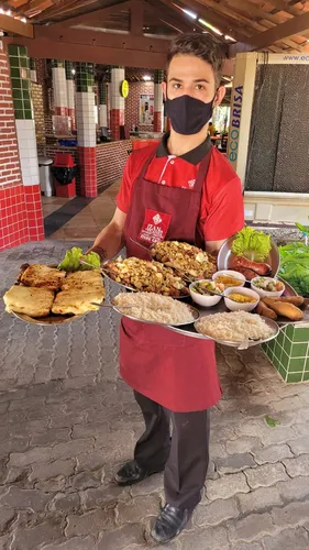 Uma dica para quando você for ao Jean da Picanha. Garçom servindo um almoço completo, com direito a carne do sol sobralense, feijão tropeiro, banana a milanesa e arroz branco.