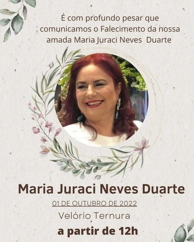 Maria Juraci Neves Duarte sempre foi sinônimo de amizade, sabedoria e elegância. Ela teve inúmeras realizações profissionais como o cargo na gestão municipal de Sobral, onde desenvolveu a função de Secretária do Desenvolvimento Urbano e Meio Ambiente, e também realizações pessoais, como no casamento com o Sr. Oswaldo Duarte, onde gerou seus mais preciosos tesouros, seus filhos: Ticiana, Flávia e Oswaldinho Duarte.