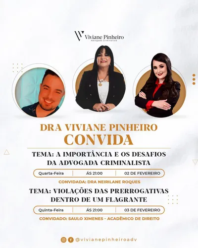 Você está convidado para assistir duas lives incríveis no perfil da Advogada Criminalista Dra. Viviane Pinheiro. Sendo hoje sua convidada Dra. Neirilane Roques, com o tema “A Importância e os Desafios da Advogada Criminalista” e amanhã o convidado Saull Ximenes com o tema “Violações das Prerrogativas Dentro de um Flagrante”.
