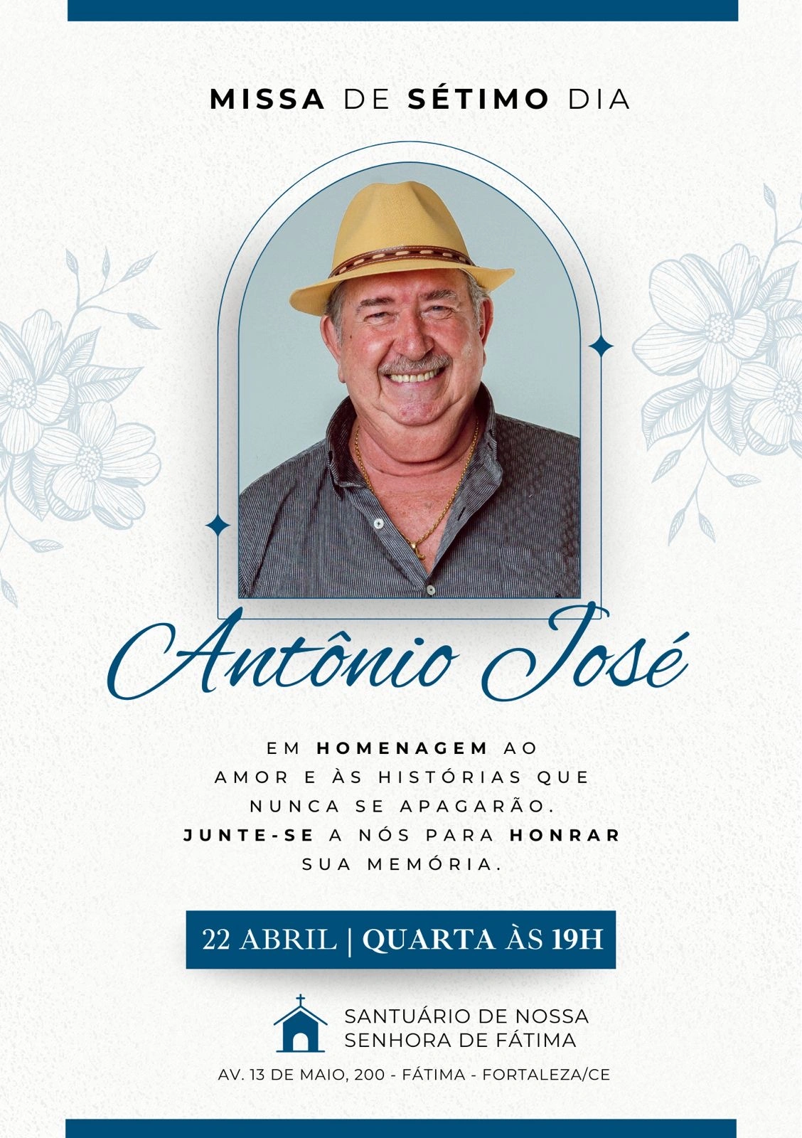 Convidamos familiares e amigos para a Missa de Sétimo Dia de Antônio José, que será realizada no dia 22 de abril, às 19h, no Santuário de Nossa Senhora de Fátima. Sua presença será muito importante neste momento de fé e saudade.