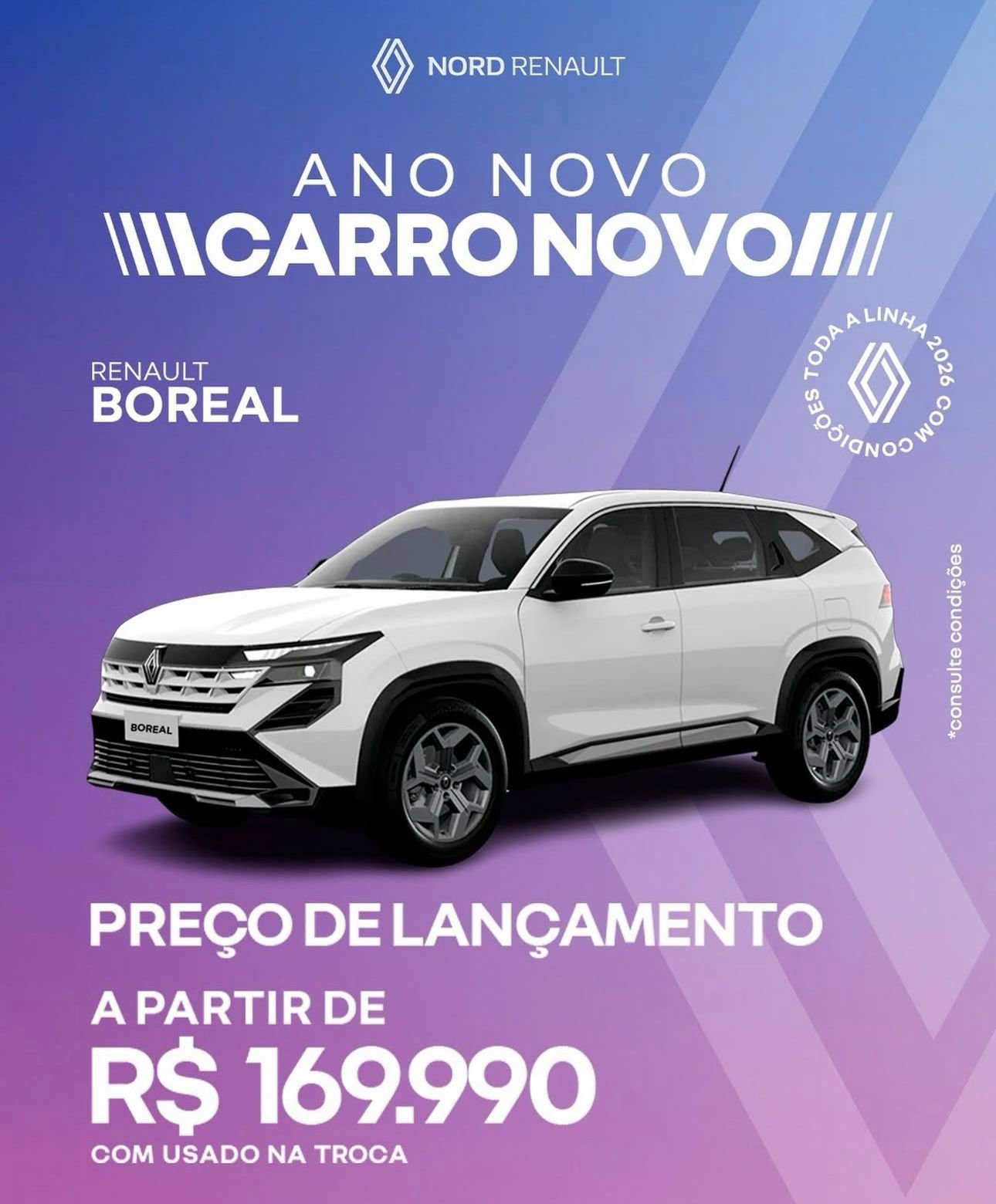 O novo Renault Boreal já está disponível com preço de lançamento a partir de R$ 169.990,00 com usado na troca ou condição especial com taxa zero.
