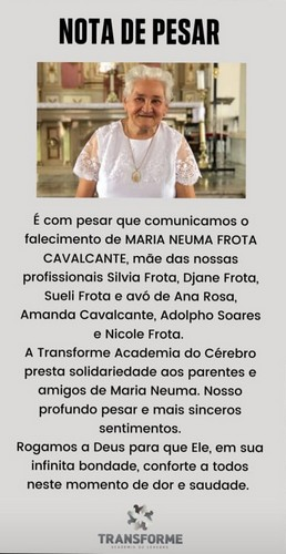 É com pesar que comunicamos o falecimento de Maria Neuma Frota Cavalcante, mãe das nossa profissionais; Silvia Frota, Djane Frota, Sueli Frota e avó de Ana Rosa, Amanda Cavalcante, Adolpho Soares e Nicole Frota.