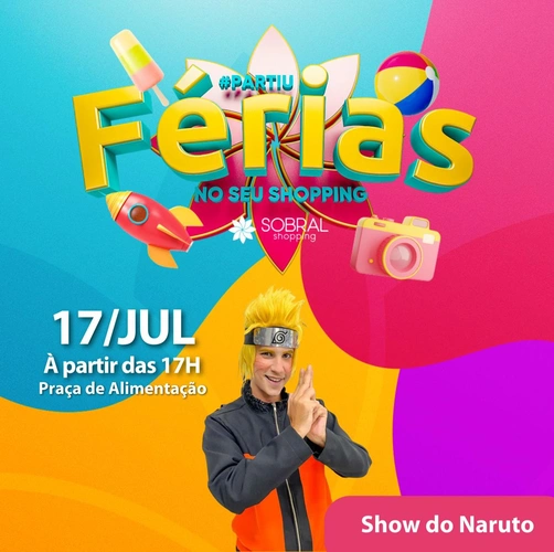 No domingo (17/07), a criançada e os amantes dos mangás japoneses vão vibrar com a primeira vez do Naruto, na praça de alimentação, a partir das 17h. A Cia Mix da Alegria, que preparou um show super especial para os sobralenses, o Sobral Shopping convida para que o público possa vir fantasiados ou com roupas e acessórios do jovem ninja que constantemente procura por reconhecimento e sonha em se tornar Hokage, o ninja líder de sua vila.