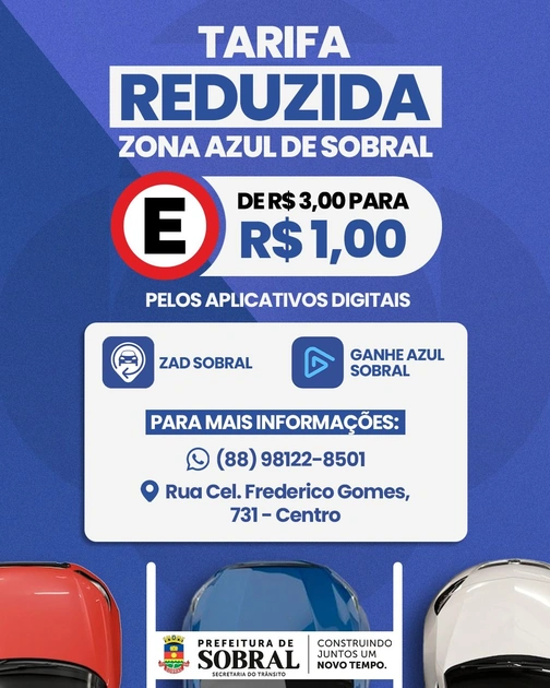 O prefeito de Sobral Oscar Rodrigues revogou o decreto da gestão anterior que estabelecia o valor de R$ 3 para a zona azul na cidade. Desde a segunda-feira (14/04), os motoristas que utilizarem as vagas de estacionamento rotativo pagarão apenas R$ 1 a hora. O objetivo da medida é fomentar o comércio local, ampliar a rotatividade de vagas e reforçar a mobilidade urbana, além de assegurar a participação inclusiva de todos os cidadãos ao Sistema Zona Azul.