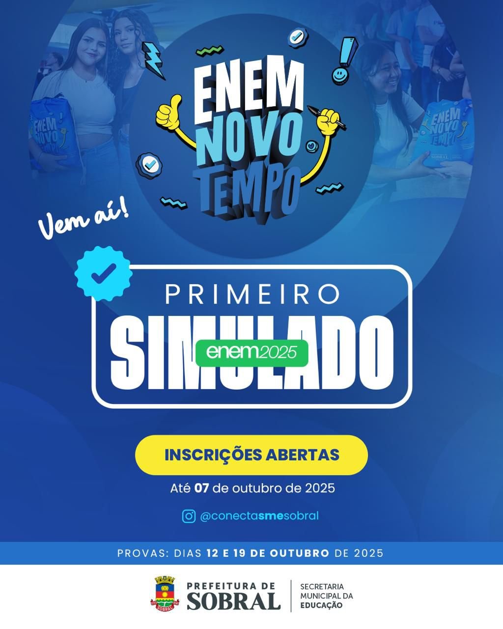 A Prefeitura de Sobral, por meio da Secretaria Municipal da Educação, realizará o 1º Simulado ENEM Novo Tempo, com o objetivo de proporcionar aos estudantes uma experiência próxima ao formato oficial do Exame Nacional do Ensino Médio (ENEM).