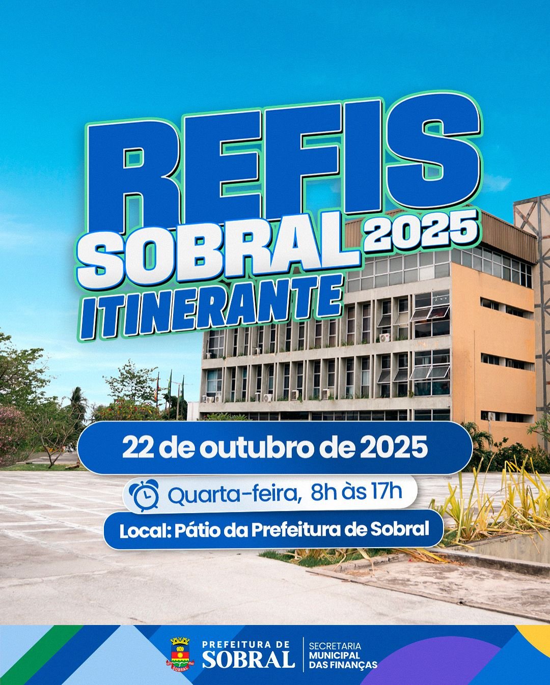 Nesta quarta-feira (22/10), a Prefeitura de Sobral, por meio da Secretaria das Finanças (Sefin) e da Agência Municipal do Meio Ambiente (AMA), promove mais uma edição do REFIS Itinerante, no pátio da Prefeitura Municipal, como parte da programação da Semana do Servidor.