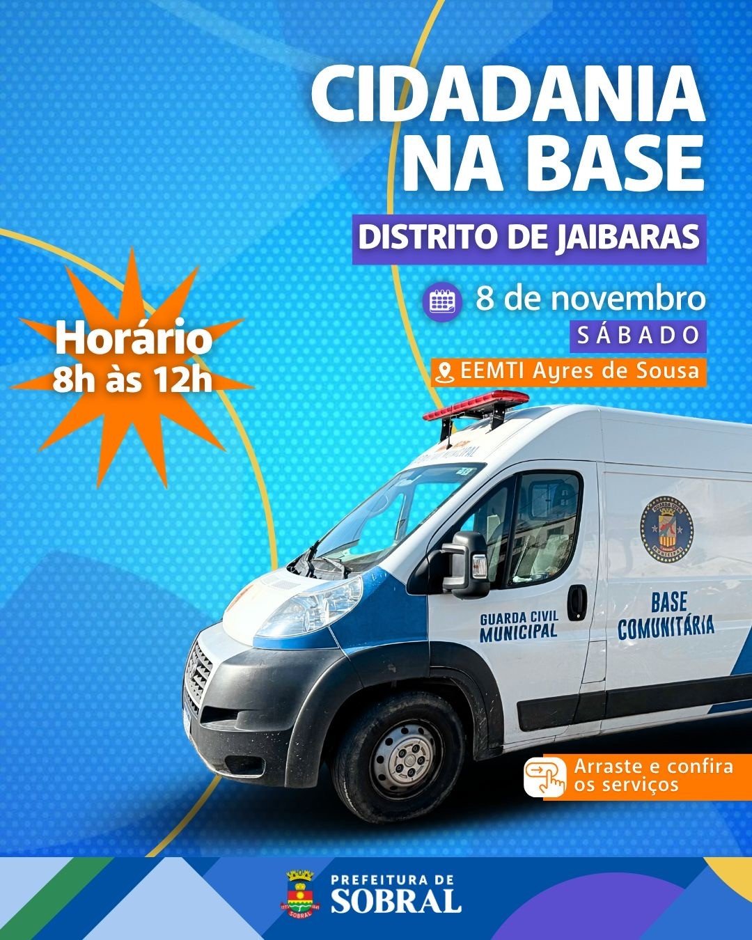 A Prefeitura de Sobral realiza, neste sábado (08/11), a 5ª edição do Cidadania na Base, levando diversos serviços gratuitos para a população do distrito de Jaibaras. O evento acontece das 8h às 12h, na Escola de Ensino Médio em Tempo Integral Ayres de Sousa.