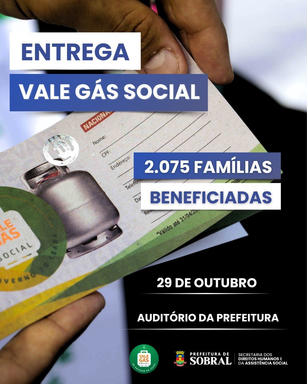 A Prefeitura de Sobral, por meio da Secretaria dos Direitos Humanos e da Assistência Social (Sedhas), realiza, no dia 29 de outubro, a entrega dos vouchers do Vale Gás Social, programa do Governo do Estado do Ceará. O evento acontecerá no Auditório da Prefeitura de Sobral, a partir das 14h, e beneficiará 2.075 famílias em situação de vulnerabilidade social.