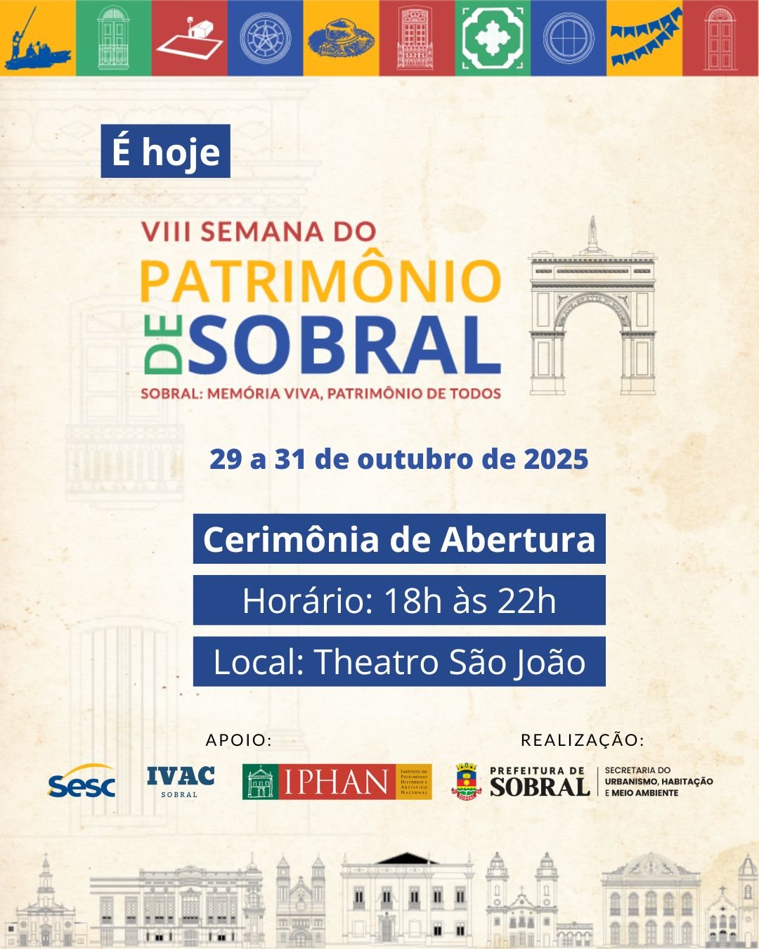 A Prefeitura de Sobral, por meio da Secretaria do Urbanismo, Habitação e Meio Ambiente (SEUMA), realiza hoje (29/10) a abertura da 8ª Semana do Patrimônio de Sobral, com o tema “Sobral: Memória Viva, Patrimônio de Todos”. A programação acontece das 18h às 22h, no Theatro São João, e contará com palestra, apresentações musicais e artísticas, além da Feira de Artesanato ASAS. Participe e celebre com a gente o patrimônio e a memória da nossa cidade!