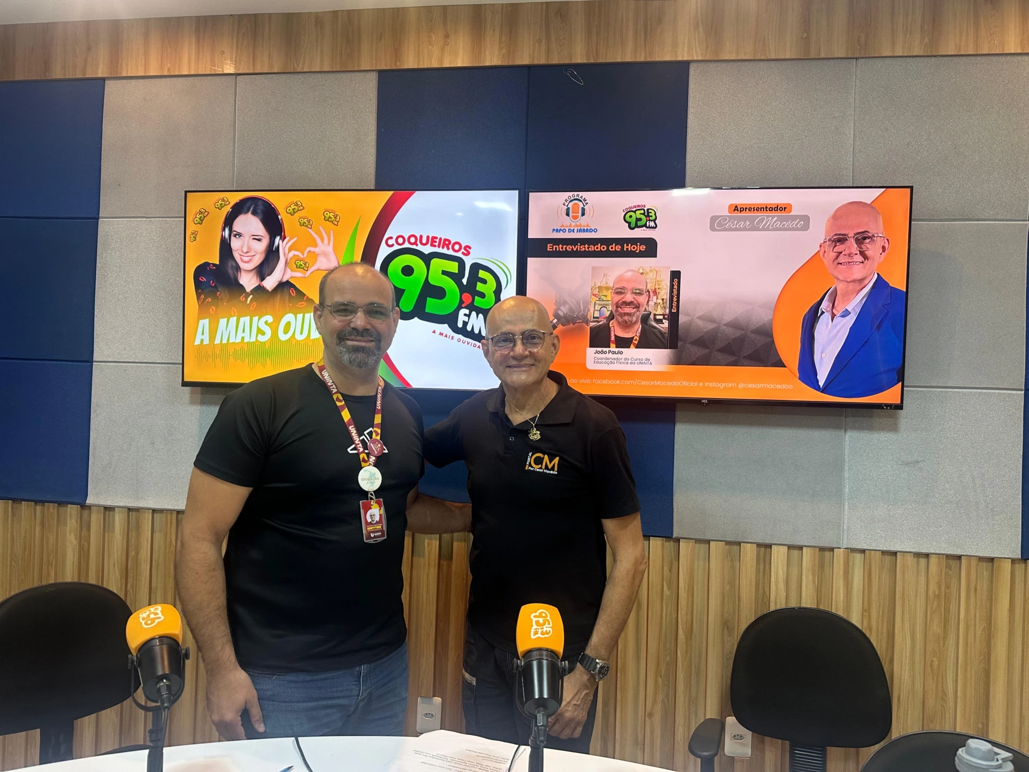 🔹 João Paulo – Coordenador do curso de Educação Física. Durante sua participação, destacou a importância da atividade física para a saúde e qualidade de vida, além de falar sobre a formação profissional na área, os desafios do mercado e o papel do educador físico na promoção do bem-estar da população.
