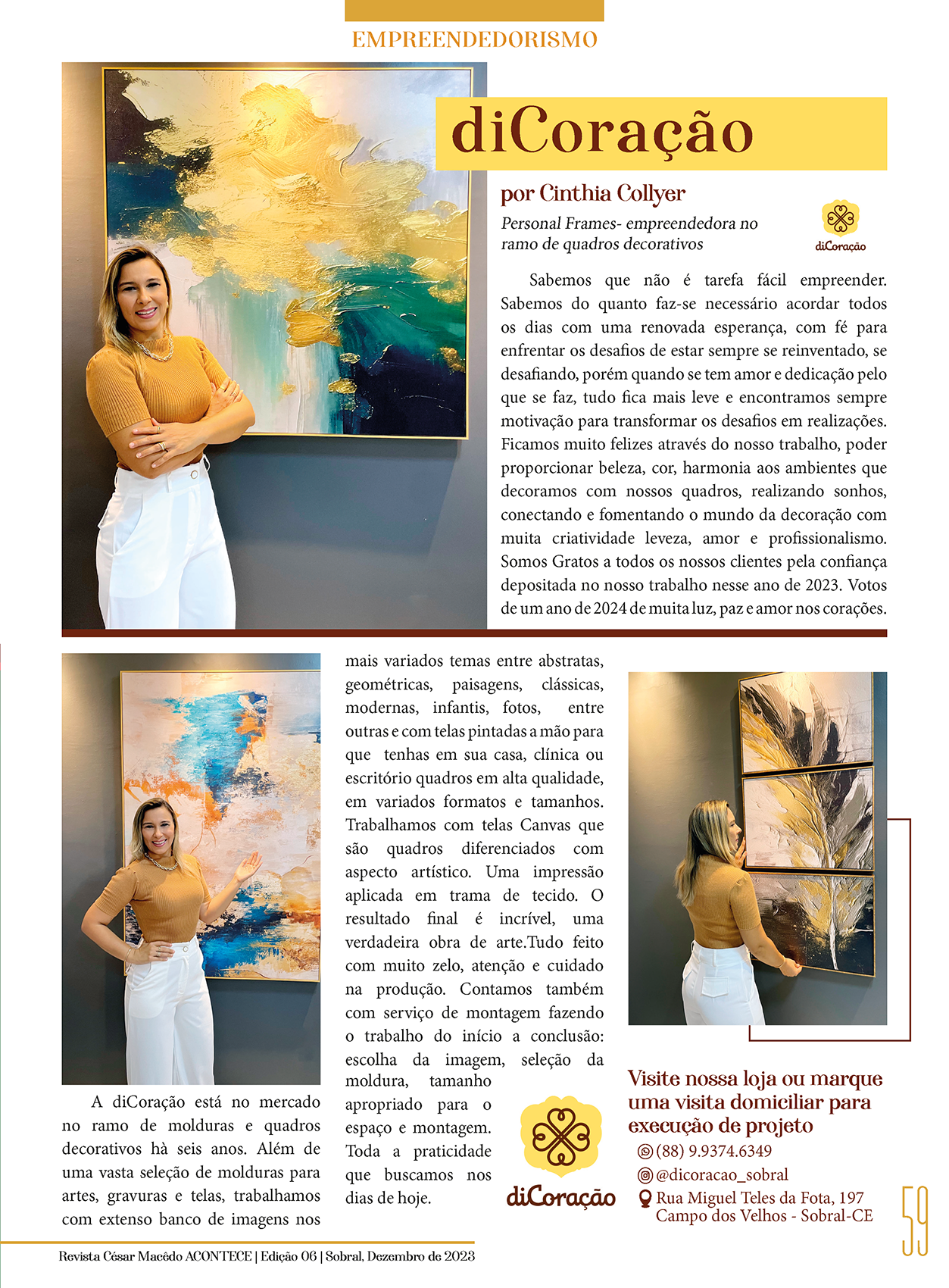 Confira a página da empresária Cinthia Collyer da DiCoração, na nossa 6ª Edição da Revista César Macêdo Acontece.