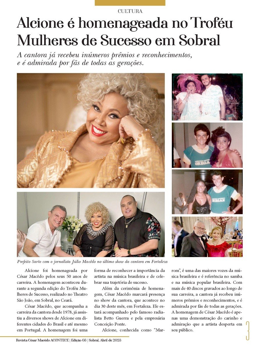 Confira a página em homenagem aos 50 Anos de carreira da cantora Alcione no Troféu Mulheres de Sucesso realizado no Theatro São João, na nossa mais nova edição da Revista César Macêdo Acontece.