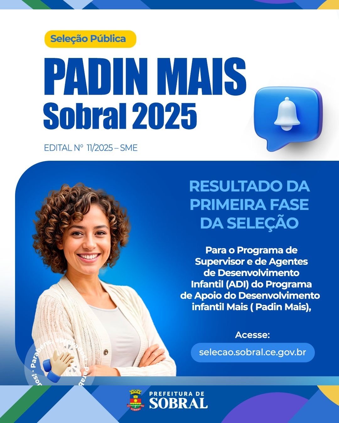 A Prefeitura de Sobral, por meio da Secretaria da Educação, divulgou o resultado da primeira fase do processo seletivo referente ao Edital nº 011/2025 – SME, que tem como finalidade a concessão de Bolsa de Pesquisa e Extensão Tecnológica no âmbito do Programa de Supervisores e Agentes de Desenvolvimento Infantil (ADI), integrante do Programa de Apoio ao Desenvolvimento Infantil Mais (PADIN Mais).