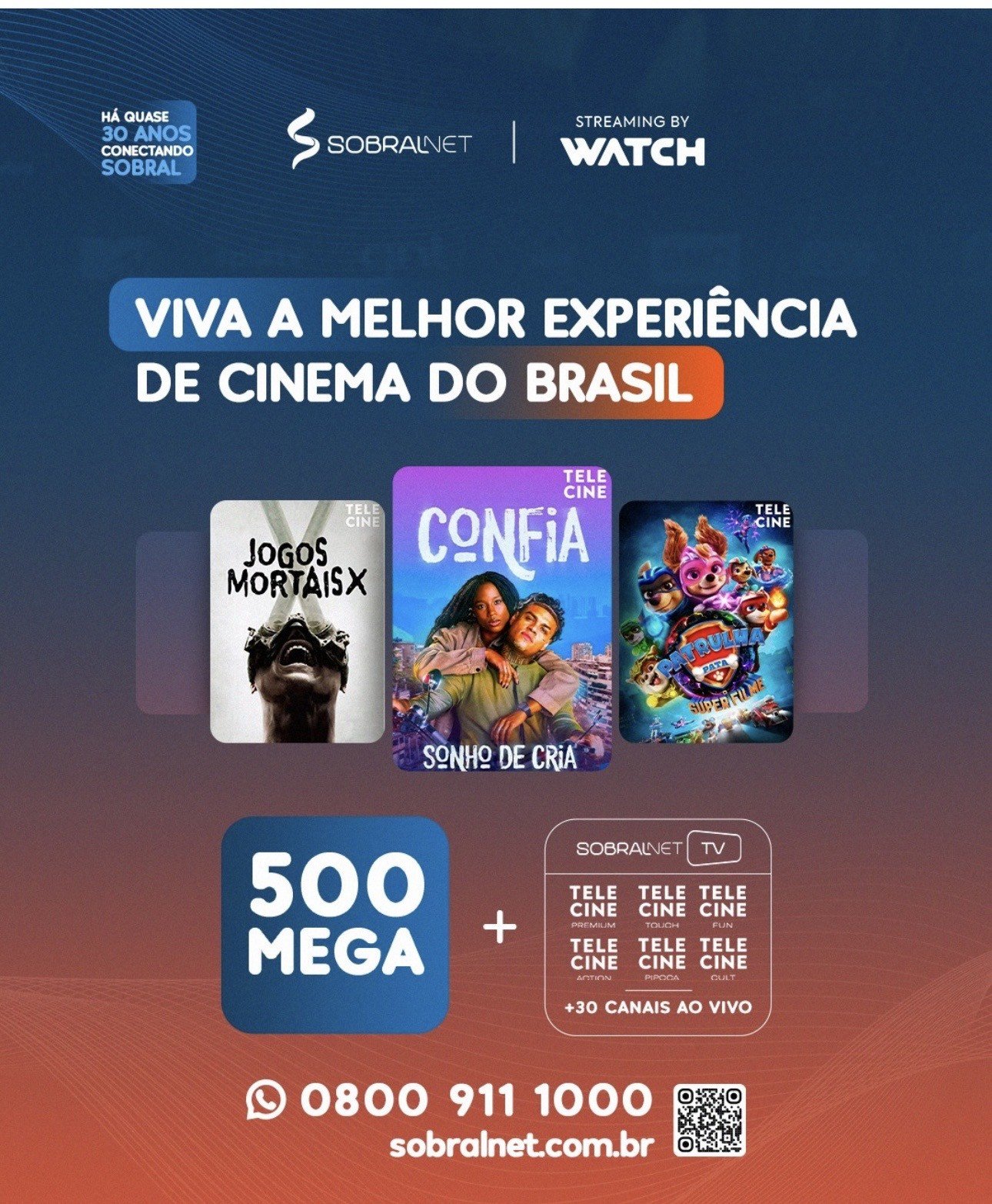 Cinema em casa com a Sobral Net TV + Watch 🍿assista os melhores filmes e séries diretamente do seu sofá com qualidade velocidade e tudo em um só lugar.