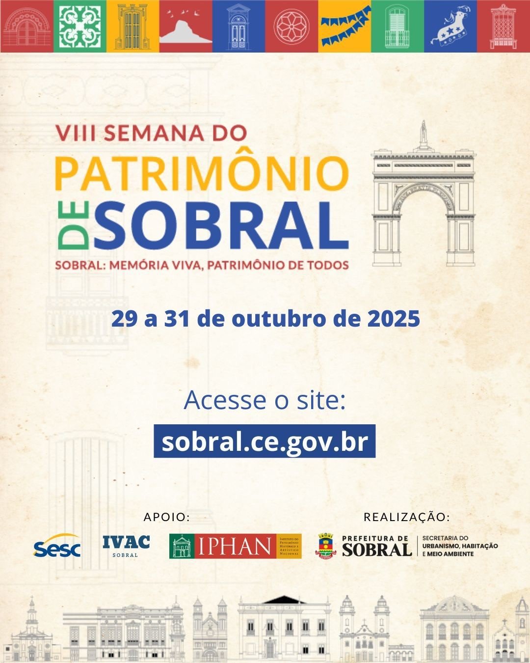 A Prefeitura de Sobral, por meio da Secretaria do Urbanismo, Habitação e Meio Ambiente (SEUMA), realiza entre os dias 29 e 31 de outubro a 8ª Semana do Patrimônio de Sobral, que neste ano traz o tema “Sobral: Memória Viva, Patrimônio de Todos”. O evento contará com programação gratuita e diversificada, incluindo palestras, rodas de conversa, oficinas, visitas técnicas, apresentações artísticas e exibições de cinema nos distritos.