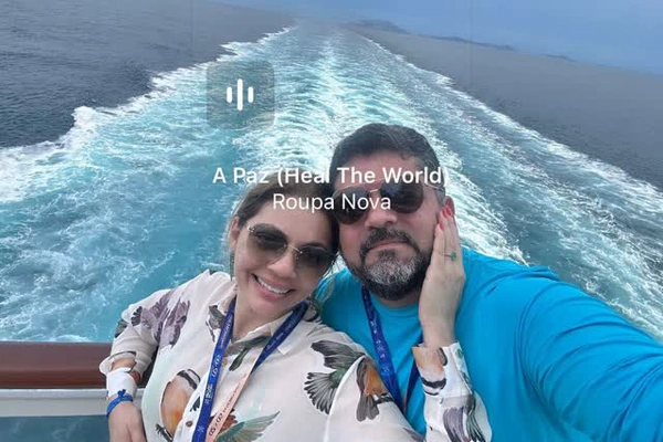 O casal Geanny Vasconcelos e Milton Alves estão felizes da vida curtindo o famoso Cruzeiro do Roupa Nova.