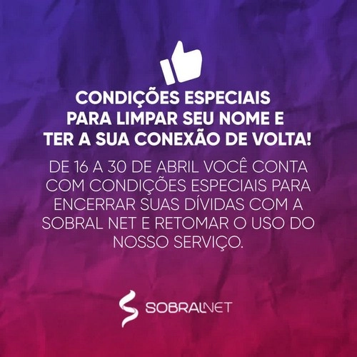 Seu nome está negativado? De 16 a 30 de Abril você conta com condições especiais para encerrar suas dívidas com a Sobral Net.