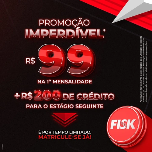 Chegou a promoção do ano, a “Super November Fisk”! Fazendo a sua matrícula em qualquer curso da Fisk, você só paga R$ 99,00 na primeira mensalidade e ganha um crédito de R$ 200,00 para o estágio seguinte!