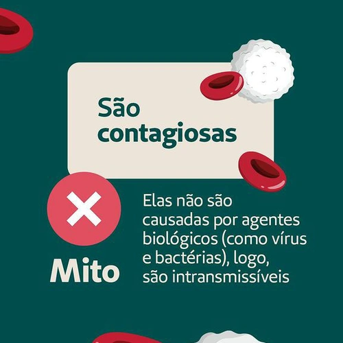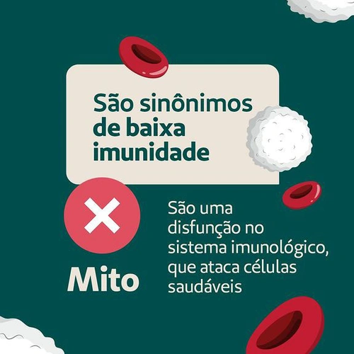 Sequência de imagens com textos e ilustrações de glóbulos vermelhos e brancos. Está escrito “3 mitos e 1 verdade sobre doenças autoimunes. Arraste a tela. São causados por baixa imunidade: mito. São uma disfunção no sistema imunológico, que ataca células saudáveis. Não têm tratamento: mito. Com os cuidados certos, o paciente mantém a qualidade de vida. São contagiosas: mito. Elas não são causadas por agentes biológicos (como vírus e bactérias), logo, são intransmissíveis. Impedem a doação de sangue: verdade, na maioria dos casos. Consulte um médico para saber se a doação é permitida. Salve este post para consultar depois. Aqui tem gente. Aqui tem cuidado”. Por último, há o logo da Unimed.