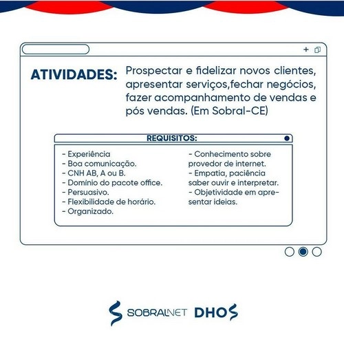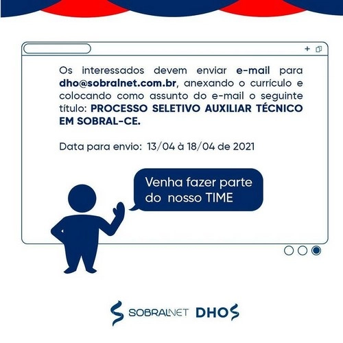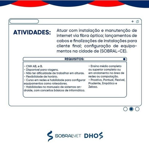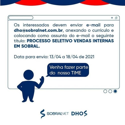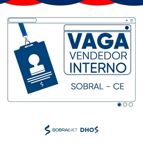 A SobralNet está contratando Vendedor Interno e Auxiliar Técnico. Saiba mais pelo RH da SobralNet.