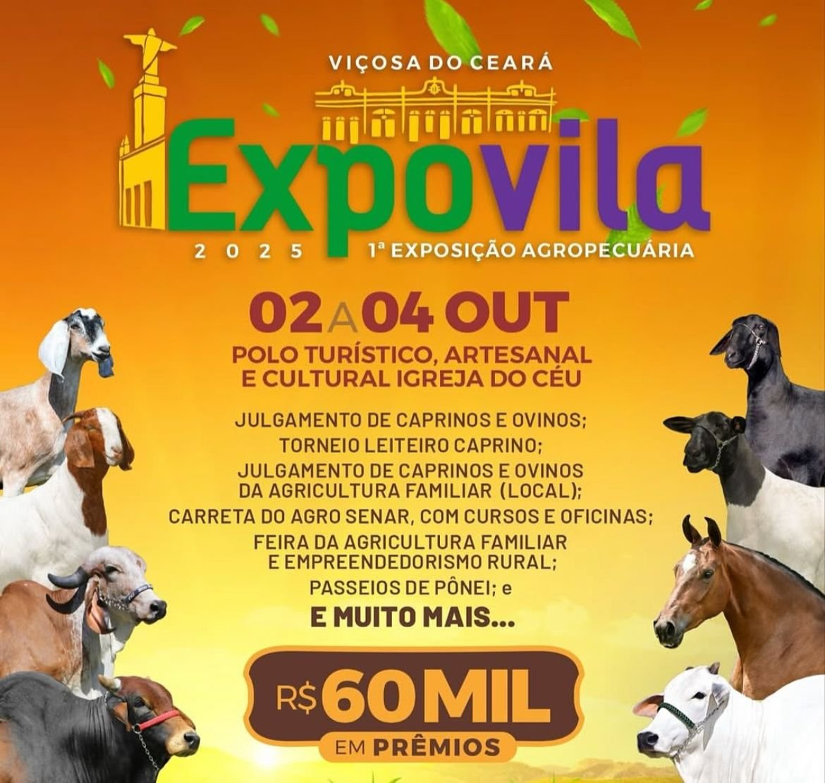 A cidade de Viçosa do Ceará se prepara para receber, entre os dias 2 e 4 de outubro de 2025, a 1ª Exposição Agropecuária de Viçosa do Ceará – EXPOVILA, que acontecerá no Polo Turístico, Artesanal e Cultural Igreja do Céu.