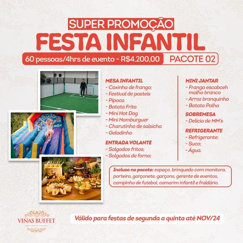 Super promoção para você realizar a festa do seu filho no Viñas Buffet. 🤩 Aproveite nossas condições especiais e venha comemorar conosco.