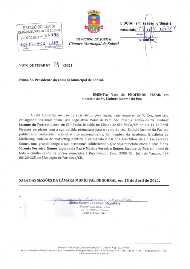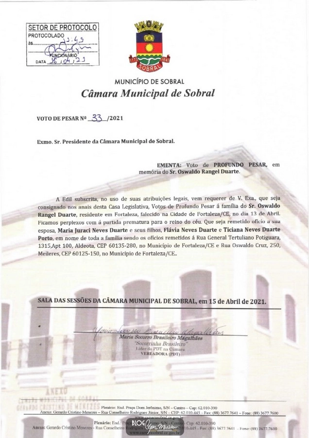 A vereadora Socorrinha Brasileiro prestou uma linda homenagem de votos de pesar na Câmara de Vereadores de Sobral ao senhores Osvaldo Rangel Duarte e Einhart Jacome da Paz.