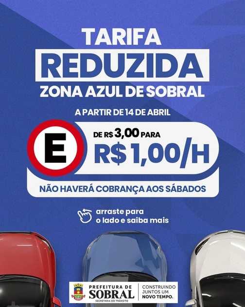 O prefeito de Sobral Oscar Rodrigues cancelou o decreto da gestão anterior e agora a zona azul cai de R$ 3,00 para apenas R$ 1,00 a hora. O objetivo da medida é fomentar o comércio local, ampliar a rotatividade de vagas e reforçar a mobilidade urbana, além de assegurar a participação inclusiva de todos os cidadãos ao Sistema Zona Azul.